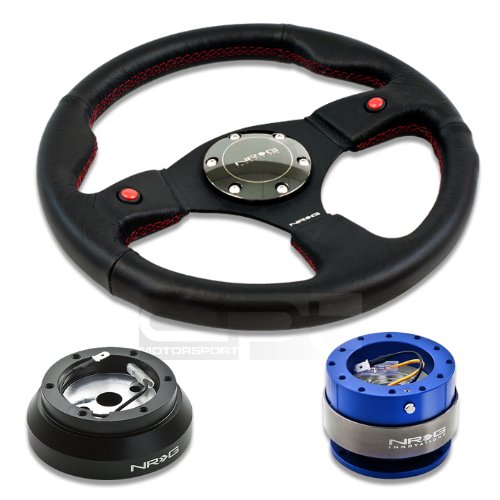NRG-SRK-140H+007R+200BL, NRG Innovations 12.5" 320mm Black Leather Red Stitch Dual Horn Button Racing Steering Wheel Combo with 6 Hole Short Hub Adapter with Gen 2.0 Blue Quick Release Kit SRK-140H